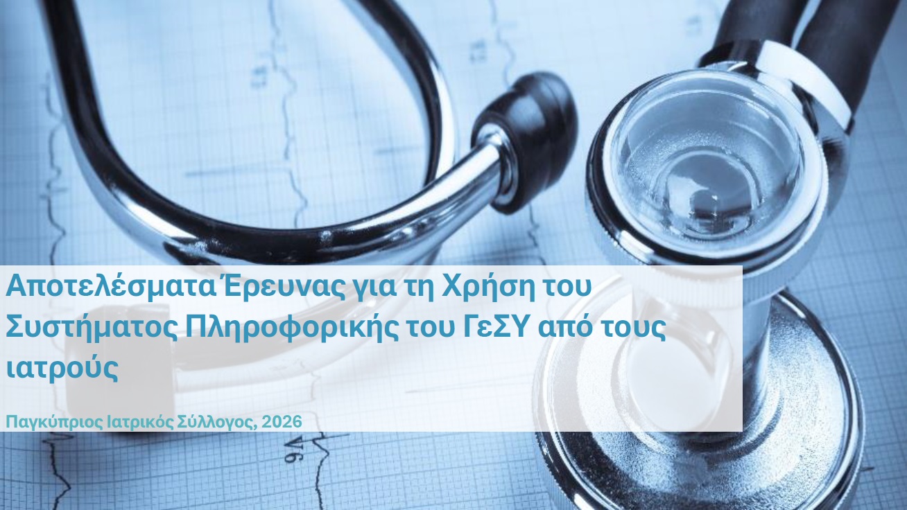 Ο Παγκύπριος Ιατρικός Σύλλογος (ΠΙΣ) δημοσιοποιεί τα αποτελέσματα παγκύπριας έρευνας για τη χρήση και τη λειτουργία του Συστήματος Πληροφορικής του Γενικού Συστήματος Υγείας (ΓεΣΥ), η οποία διεξήχθη με τη συμμετοχή 728 ιατρών συμβεβλημένων με το ΓεΣΥ, όλων των ειδικοτήτων.